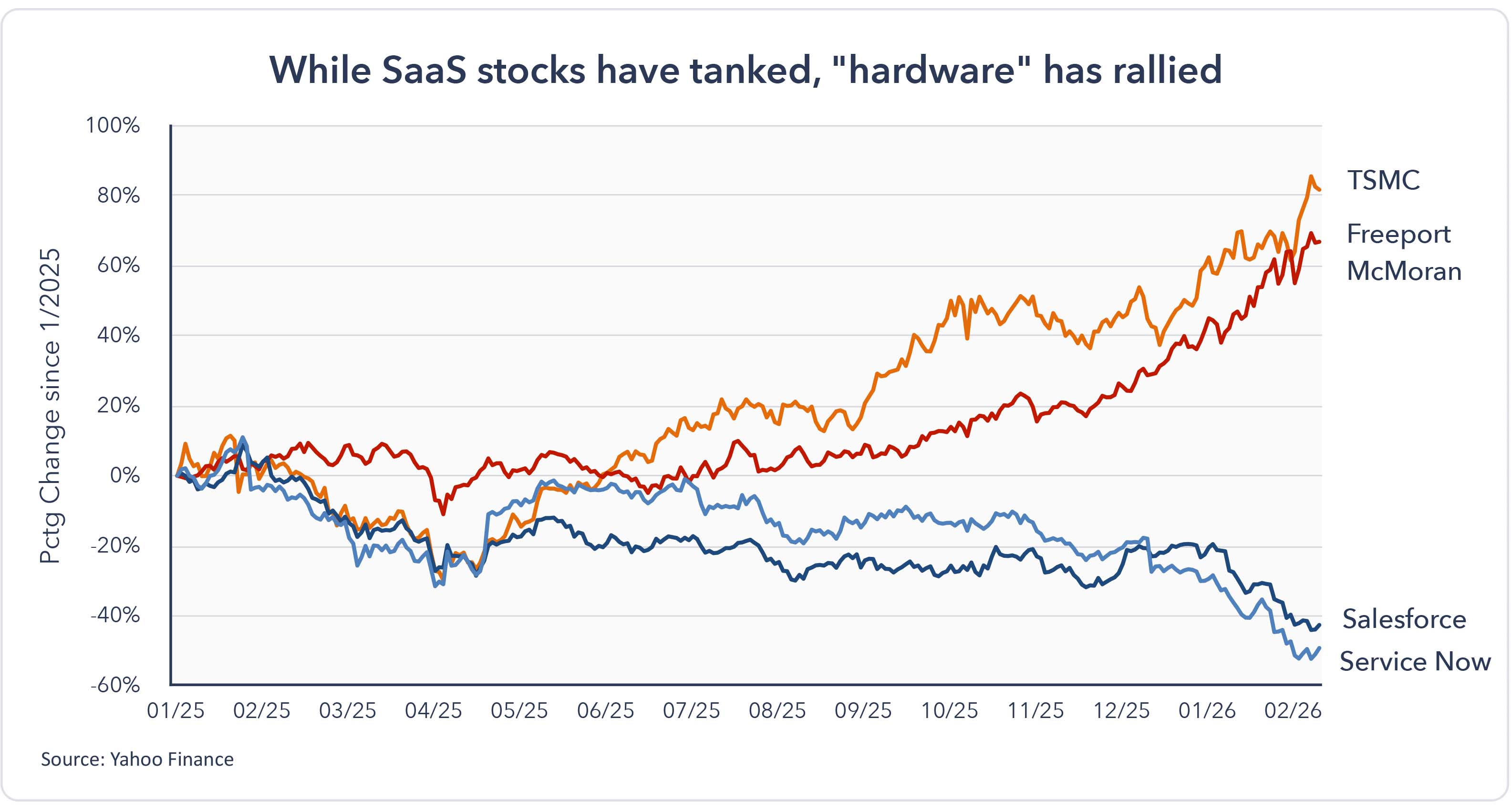 The SaaS sector faces existential margin compression as AI models replicate functionality at dramatically lower costs. Meanwhile, value migrates toward companies at the intersection of software and hardware: those building physical infrastructure for AI compute, manufacturing robots and autonomous systems, and controlling materials and energy resources.